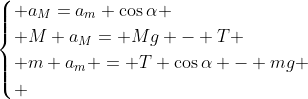 La prima eq. è dovuta al fatto che l'accelerazione di M è pari alla componente parallela al filo di quella di m, le alre sono solo le forze agenti sulle due masse.