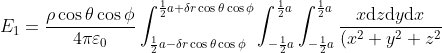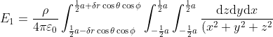 }^{\frac{1}{2}a-\delta r \sin \theta}\int_{-(\frac{1}{2}a-\delta r \cos \theta \sin \phi)}^{\frac{1}{2}a-\delta r \cos \theta \sin \phi}\frac{\textup{d}z\textup{d}y\textup{d}x}{x^2+y^2+z^2}\frac{(x,y,z)\cdot (\cos \theta \cos \phi, \sin \theta, \cos \theta \sin \phi)}{\sqrt{x^2+y^2+z^2}})